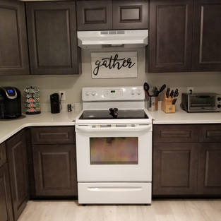 After finishing the bay window, the customer wanted to redo the kitchen and countertops. Shown here are before pictures on top and the after pictures on the bottom. They switched from white cabinets with tiled countertops to dark cabinets and white quartz countertops.